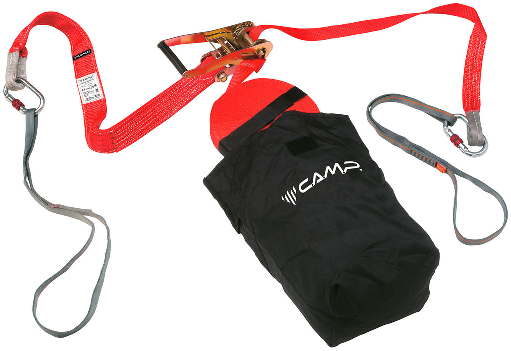 dispositivo temporaneo portatile utilizzato per installare una linea di ancoraggio flessibile orizzontale, concepita per l'utilizzo contemporaneo di due persone al massimo, lunghezza regolabile da m.5 a 18, composizione: fettuccia in poliestere da mm.35 KN 30, cricchetto in acciaio, fettuccia in poliestere da mm.50 KN 60, 2 moschettoni, 2 anelli in fettuccia.