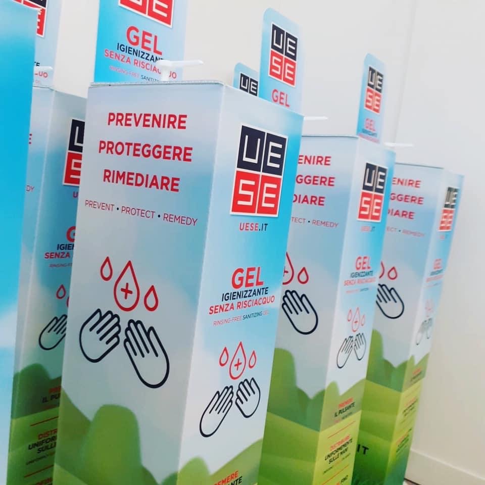 per la distribuzione di gel igienizzante per le mani, posizionabile all'ingresso dei negozi, resistente agli urti, stabile, struttura in polionda, fornito già assemblato e completo di tanica da lt.5 di gel a base alcolica, dimensioni cm.18,5x23,8x127H.