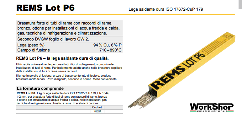 Brasatura forte di tubi di rame con raccordi di rame, bronzo, ottone per installazioni di acqua fredda e calda, gas, tecniche di refrigerazione e climatizzazione. Secondo DVGW foglio di lavoro GW 2. Lega (peso %) 94% Cu, 6% P.