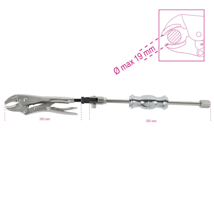 La pinza autobloccante con massa battente scorrevole da 1 kg è ideale per l'estrazione di prigionieri, viti spezzate e per il tiraggio di lamiere, specialmente nel settore della carrozzeria.