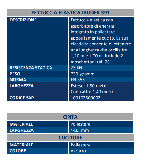 Cintura elastica con assorbimento d’energia integrato, prodotto in poliestere. La sua elasticità permette di avere una lunghezza che oscilla tra 1,20 m e 1,80m. Include 2 moschettoni ref. 981.