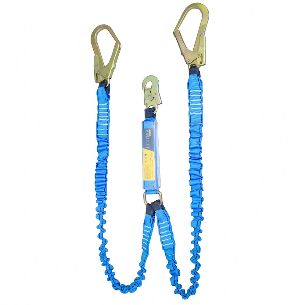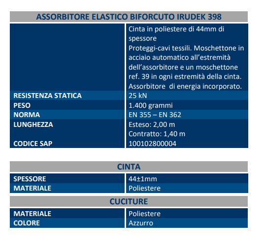 Assorbitore di cintura elastico biforcuto + 1 moschettone in acciaio automatico integrato nell’assorbitore + 2 moschettoni in acciaio apertura 55mm.