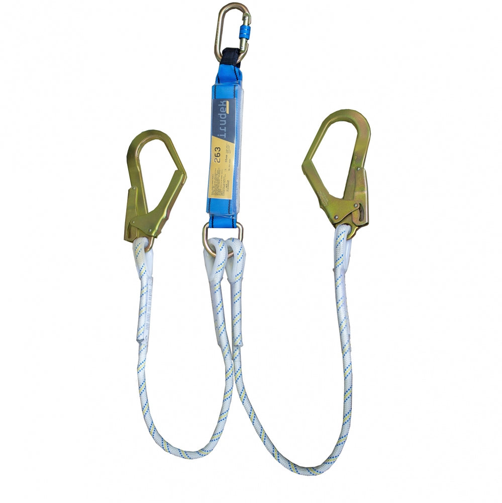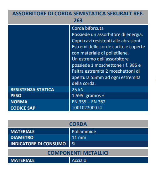 Assorbitore di corda semistatica biforcuta + 1 moschettone in acciaio automatico integrato nell’assorbitore + 2 moschettoni in acciaio con apertura 55mm.