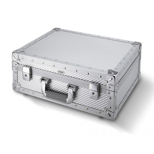 Valigia Linea Grinta. Robustissima valigia di forma squadrata realizzata in esclusivo alluminio antigraffio goffrato FramWL, finitura anodizzata argento satinato.