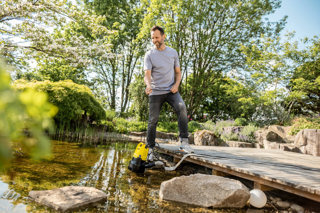 La SP 22.000 Dirt è la più potente pompa sommergibile per acque sporche di Kärcher. Con un massimo di 22.000 l/h, è perfetto per lavori di drenaggio particolarmente impegnativi come in grandi laghetti da giardino, scantinati allagati o fosse di costruzione. Le pompe possono gestire particelle di sporco fino a 30 mm. Se le particelle di sporco più grandi minacciano di causare un blocco, il prefiltro integrato in acciaio inossidabile può essere abbassato per proteggere la girante della pompa. La guarnizione ad anello scorrevole utilizzata anche nella gamma Professional garantisce una durata extra lunga. C'è anche la possibilità di estendere la garanzia a cinque anni. L'interruttore a galleggiante consente altre funzioni pratiche: accende e spegne automaticamente la pompa a seconda del livello dell'acqua, impedisce il funzionamento a secco e la sua altezza può essere regolata. Può anche essere fissato in modo che la pompa sommersa pompi fino a una profondità di 35 mm durante il funzionamento continuo. La filettatura di collegamento Quick Connect consente anche il collegamento rapido e semplice di tubi da 1", 1 1/4" e 1 1/2".