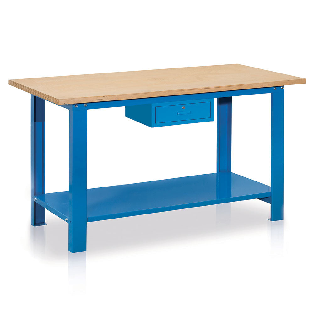 Banco da lavoro con piano in multistrati di faggio spessore mm. 30, 2 fiancate e 1 sottopiano sagomato e rinforzato e 1 cassetto scorrevole su guide con cuscinetti a sfera e serratura.Portata kg.750. Smontato. Verniciatura a polvere blu RAL 5015. Dimensioni: mm. 1500Lx750Px880H.