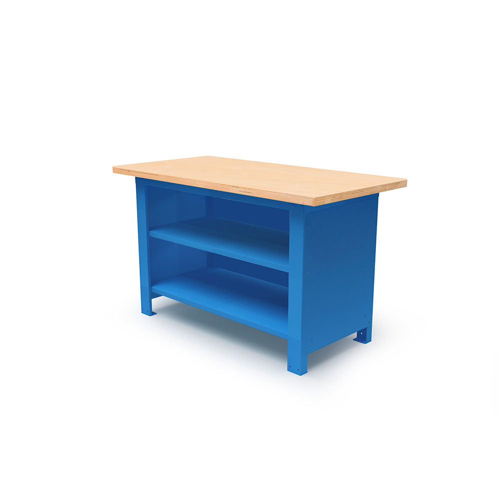 Banco da lavoro con piano in multistrati di faggio spessore mm. 30, pannellature laterali e posteriori, 2 fiancate, 1 pianetto e 1 sottopiano sagomato e rinforzato.Portata kg.750. Smontato. Verniciatura a polvere blu RAL 5015. Dimensioni: mm. 1500Lx750Px880H.