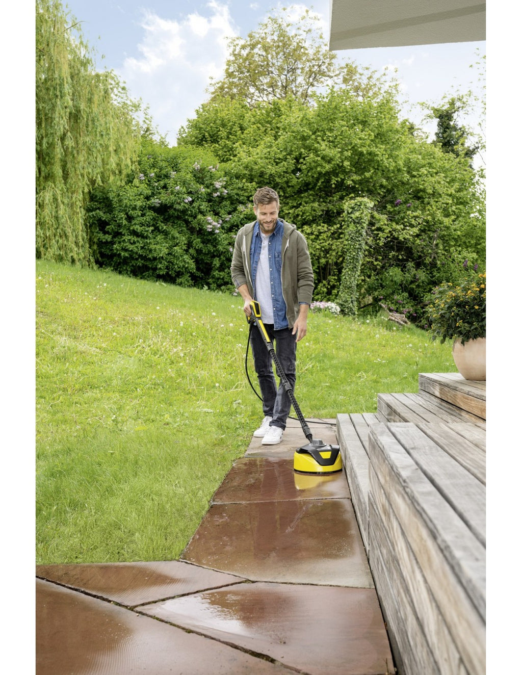 Il braccio rotante a doppio getto del pulitore di superficie T 5 T-Racer è in grado di rimuovere lo sporco su grandi aree - per una pulizia rapida ed efficiente di grandi aree esterne.