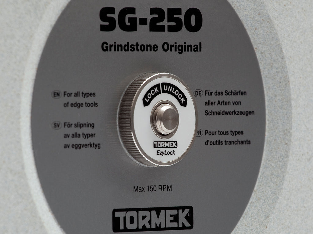 Con Tormek EzyLock, che funge sia da dado sia da rondella, non occorrono utensili per montare e smontare la mola. La speciale inclinazione sulla filettatura sinistra induce la rotazione della ruota a serrare il dado alla giusta coppia.