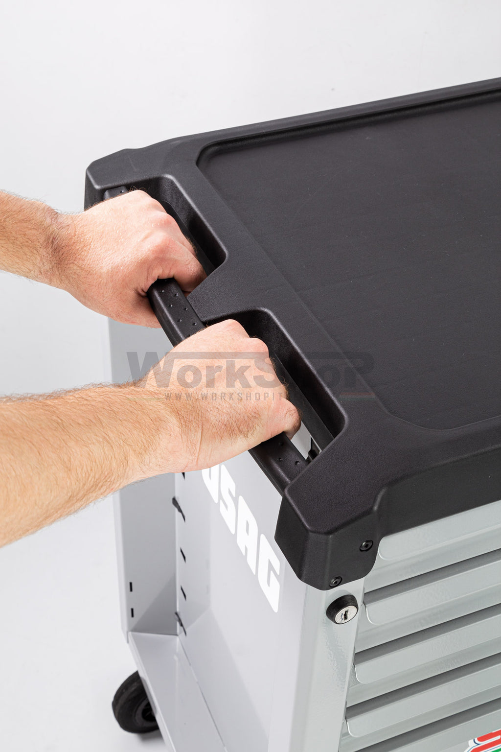 • Piano di lavoro in ABS con bordo anticaduta con doppia maniglia di trasporto.