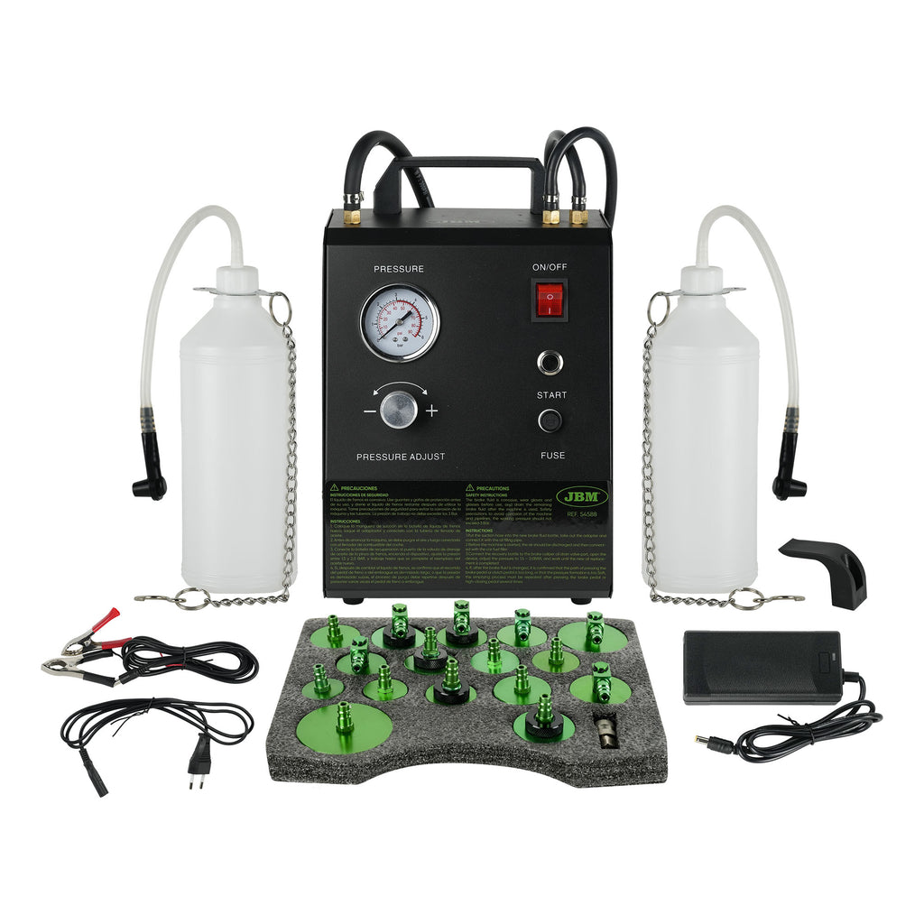 Questo purgatore di freni utilizza un sistema elettrico per generare pressione ed estrarre l'aria intrappolata nel sistema frenante. Questo kit è dotato di vari adattatori ed è universale.