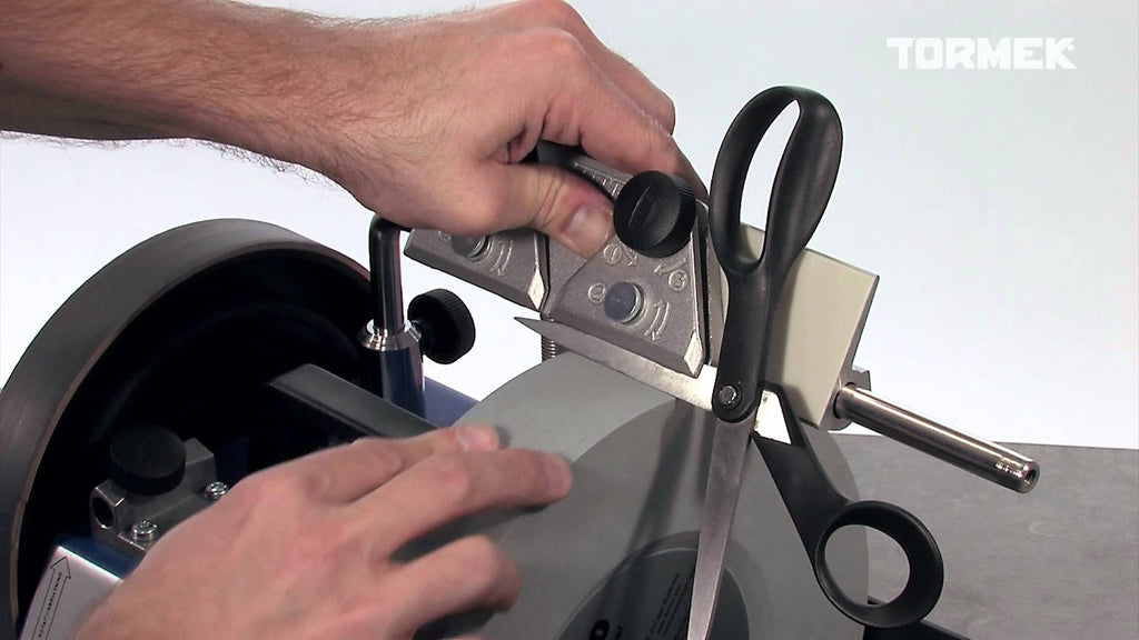 Le forbici vengono montate in un supporto che scorre liberamente su una piastra di sostegno. L'angolo di affilatura può essere impostato in modo da replicare esattamente quello già esistente.