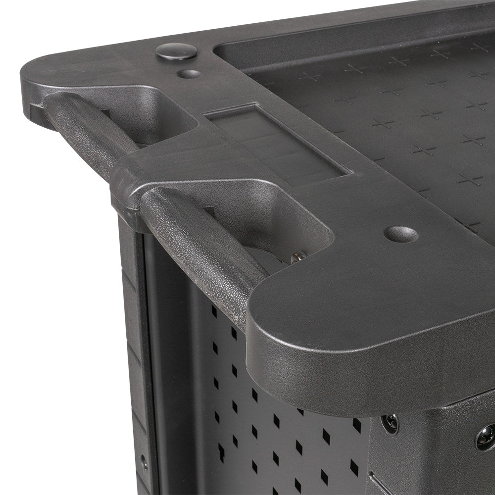 Area di stoccaggio laterale. Lati perforati per consentire all'utente di aggiungere una grande quantità di accessori.