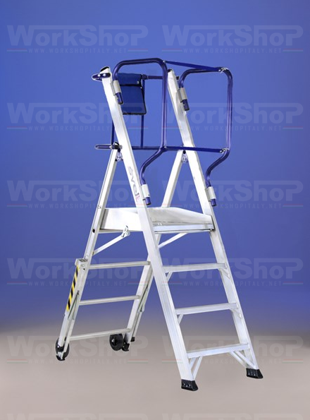 Conforme alle nuove Norme Europee UNIEN131/7 sulle scale a castello offre una protezione a 360° e un evoluto sistema anti-ribaltamento che può essere richiuso per consentire di lavorare anche contro una parete. Dotata di gradini piani di salita.