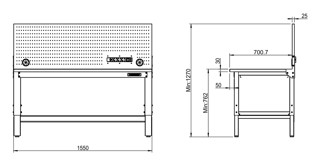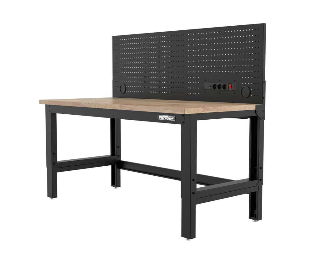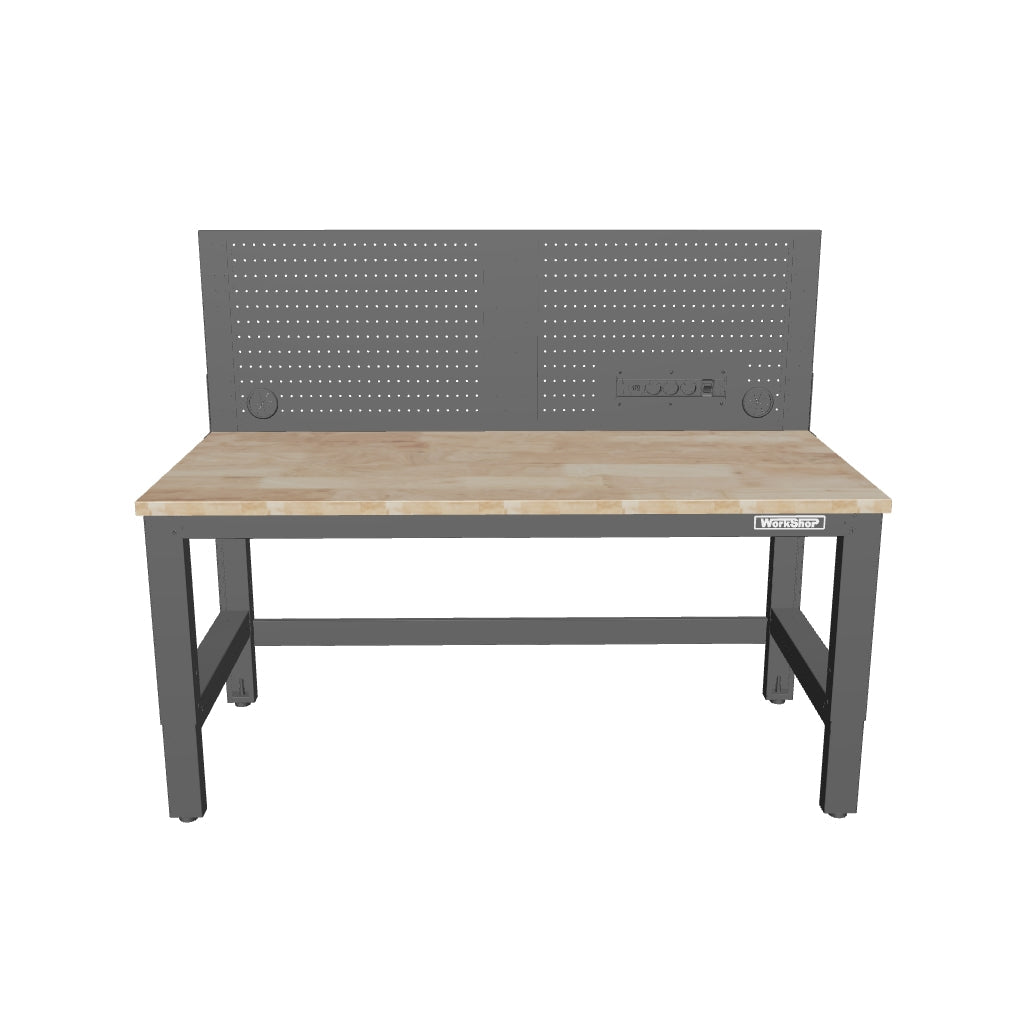 BANCO DA LAVORO DA 1550x725mm CON PIANO DI LAVORO IN LEGNO E PANNELLO FORATO CON PRESA ELETTRICA