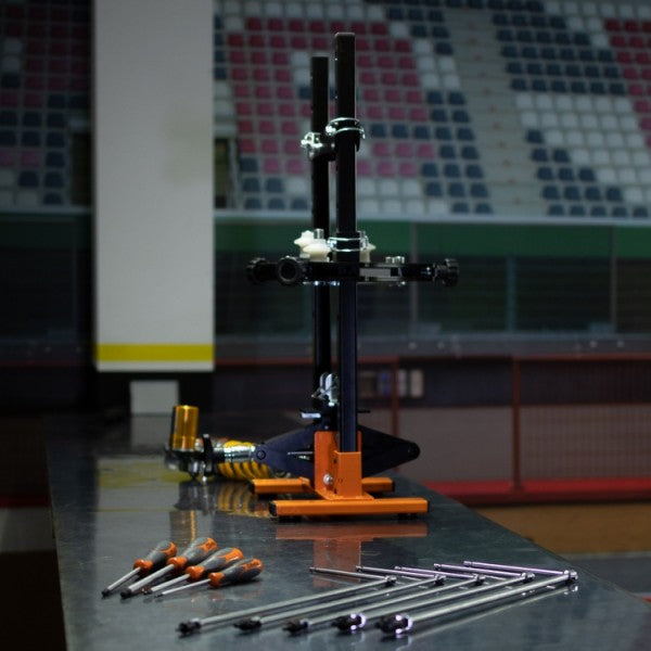 Attrezzo manuale, da banco, per smontaggio ammortizzatori posteriori e forcelle anteriori dei motocicli