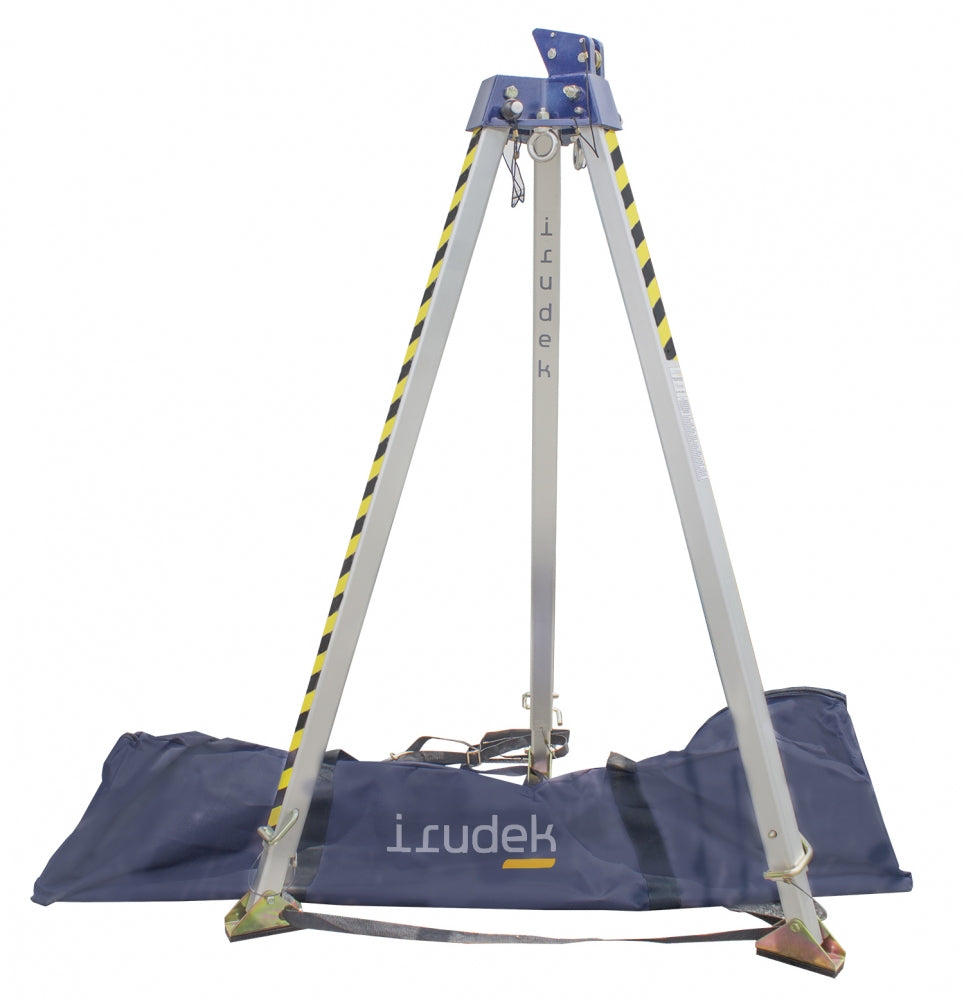 Il treppiede è dotato di 1 puleggia, 2 anelli di ancoraggio, 1 custodia di trasporto in nylon e 1 cinghia da 25 mm per il fissaggio del treppiede quando è in posizione aperta. I supporti al suolo sono in gomma per fornire una maggiore stabilità.