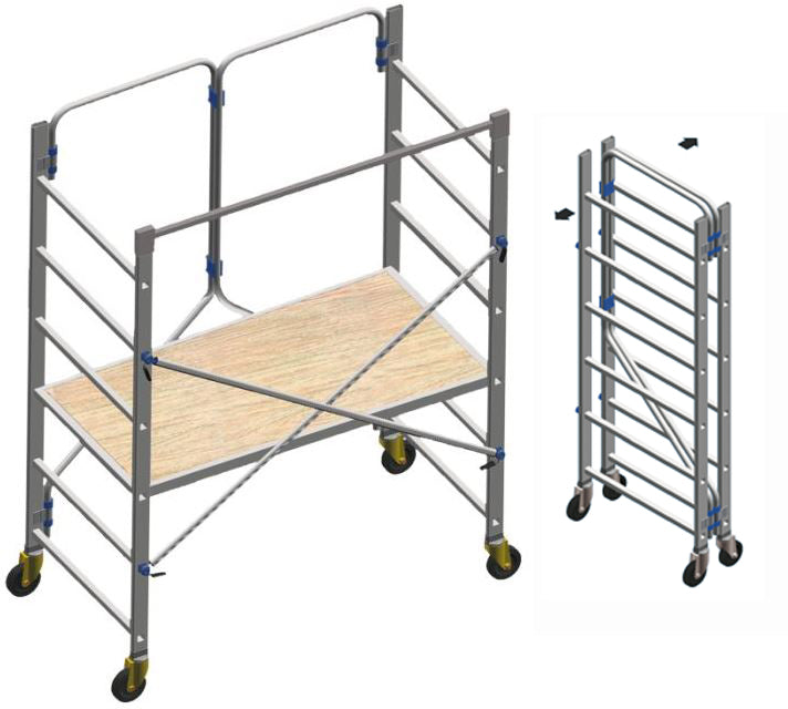 a norme italiane D.lgs.81/2008 in alluminio, portata kg.150, H.struttura m.1,99, H.Lavoro m.2,86, H.piano di lavoro m.0,85 dimensioni m.1,53x0,68 in alluminio e legno antiscivolo idroresistente, pieghevoli, peso kg.31,5