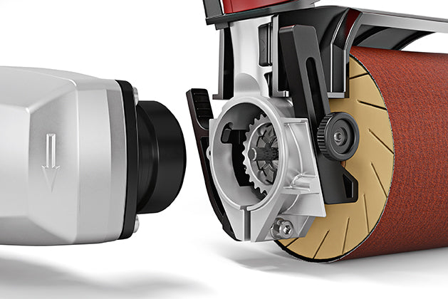 - Singolare attacco utensile a innesto rapido per cambiare senza attrezzi gli attacchi del sistema di satinatura e levigatura a nastro per tubi