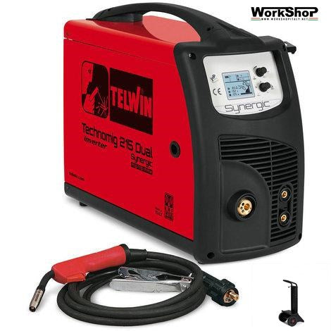 Saldatrice a filo Telwin con funzione di inverter, modello Technomig 215 Dual Synergic, per la saldatura Mig - Mag, Flux e Brazing con capacità di saldatura di filo di ogni genere con sezione minima 0,6 mm e massima di 1,2 mm.Caratterizzata da un ottima flessibilità, data dalla possibilità di saldare e saldobrasare un vasta varietà di materiali.Estremamente semplice da utilizzare, Basterà infatti impostare lo spessore del materiale da saldare ed al resto penserà la macchina, il controllo intelligente ed automatico dell'arco penserà a mantenere performance di saldatura estremamente elvate istante per istante, su ogni materiale, con qualsiasi gas d'apporto ed in ogni situazione di lavoro.La possibilità di regolazione manuale della lunghezza dell'arco elettrico consente all'operatore di trovare le giuste condizioni per garantirgli un ottimo confort per poter effettuare delle ottime saldature.Saldatrice con corrente di ingresso di 230 V, amperaggio minimo e massimo rispettivamente di 20 e 220 A, voltaggio 78 Fornita di serie con torcia per la saldatura TW 160 con due metri di cavo (cod. 742402) e cavo di massa con pinza d 3 mt diam. 16 mm.Gazie alla possibilità di ampliare la macchina con l'apposito kit per gas, è possibile appunto effettuare la saldatura con apporto di gas, Co2, Argon oppure miscela Argon-Co2.Altra caratterisca molto importante della macchina sono il peso e le dimensioni ridotte, solo 22,3 kg con 620 x 260 x 490 mm di lunghezza, larghezza e altezza, che ne permetto il trasporto senza troppa fatica.