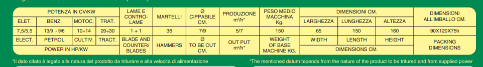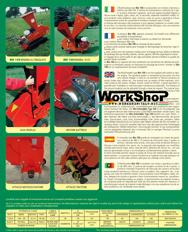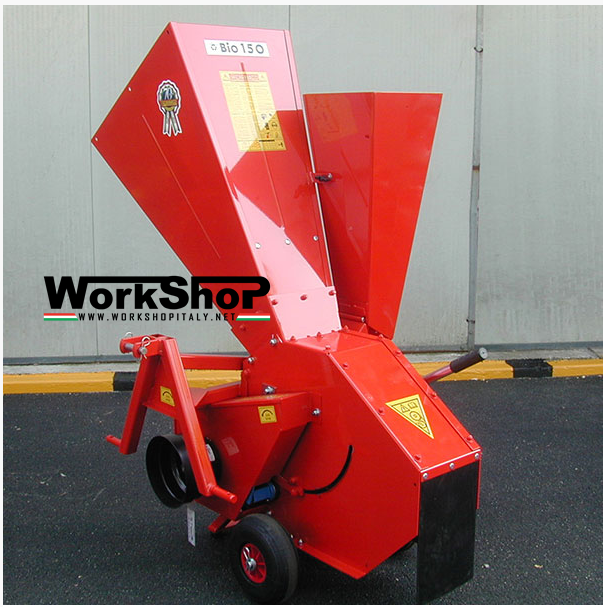 Il Biotrituratore tipo Bio 150 è accessoriato con motore a benzina o elettrico da 380 Volt. Il sistema di macinazione è costituito da 2 parti: la prima chiamata Cippatore, serve per tagliare prodotti legnosi o fibrosi come il legno, tiglio, salice, etc; la seconda, mediante martelletti mobili, tritura prodotti come fogliame, siepi, terriccio, scarti di cucina e garantisce il buon funzionamento anche se casualmente venissero introdotti sassi o chiodi. La finezza del macinato e del composto si può regolare mediante un crivello mobile con leva. La naturale trasformazione del triturato Biologico crea una sostanza ricca di valori proteici da riutilizzare come concime.