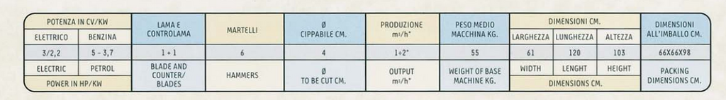 Il biotrituratore tipo BIO 50 è accessoriato con motore a benzina o elettrico da 220 Volt. Il sistema di macinazione è costituito da una lama sfaldatrice che opera una prima grossolana riduzione del materiale introdotto, e da martelli mobili che effettuano la triturazione finale. La finezza del macinato e del composto è regolata dal crivello. La naturale trasformazione del triturato Biologico crea una sostanza ricca di valori proteici da riutilizzare come concime