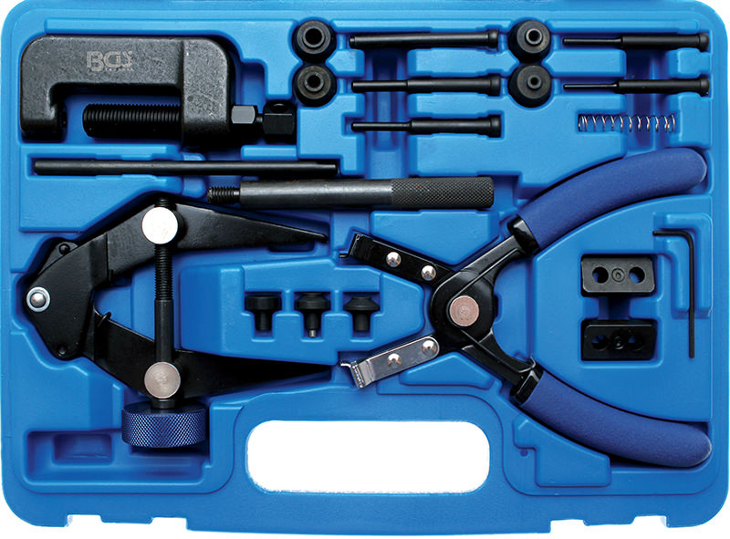• contiene gli utensili necessari in caso di sostituzione della catena di motocicli • comprende: - pinze per installazione e rimozione chiusura a clip per catene - utensile di bloccaggio catena, per trattenere le estremità della catena - utensile apri-maglie e rivettatore, per l’apertura e la chiusura di catene di distribuzione e trasmissione • per perni Ø: 2,2 - 2,9 - 3,8 - 4,8 mm • peso 1,5 kg |