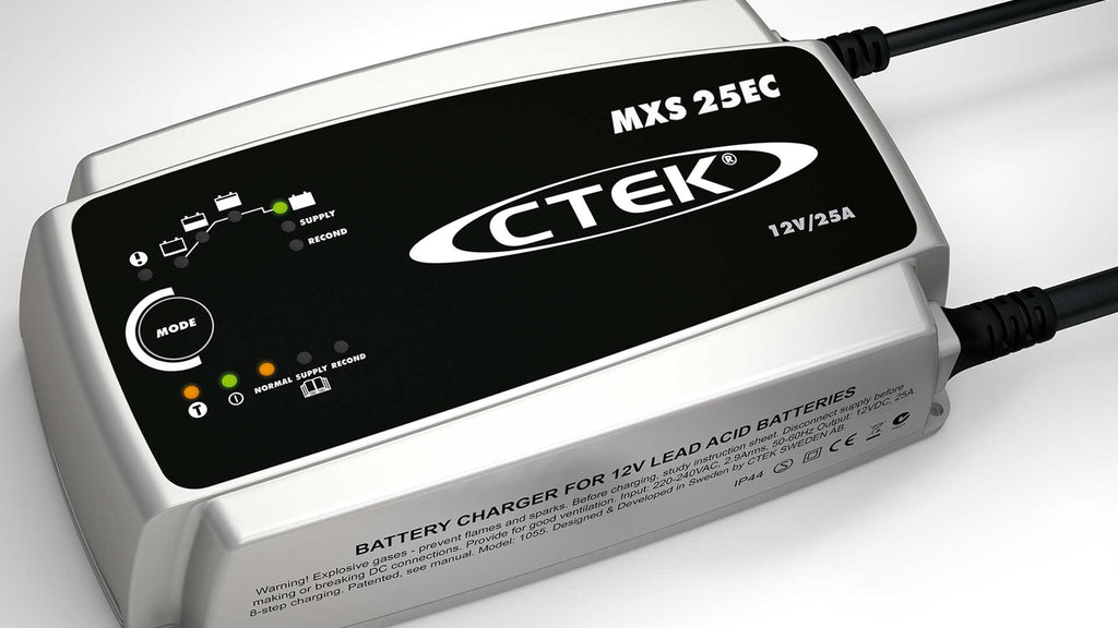 MXS 25EC di CTEK è un caricabatterie intelligente e unità di supporto a 8 fasi completamente automatico che eroga una corrente di 25 A per batterie a 12 V da 40–500 Ah.
