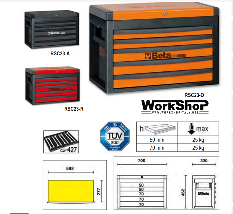 Cassettiera portautensili Beta con 5 cassetti da 588x277 mm, montati su guide telescopiche a sfera: