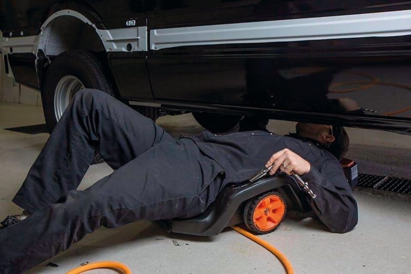 - 2 ruote da 178 mm con doppio cuscinetto che permettono l'utilizzo anche su superfici sconnesse e il superamento di tubi/cavi