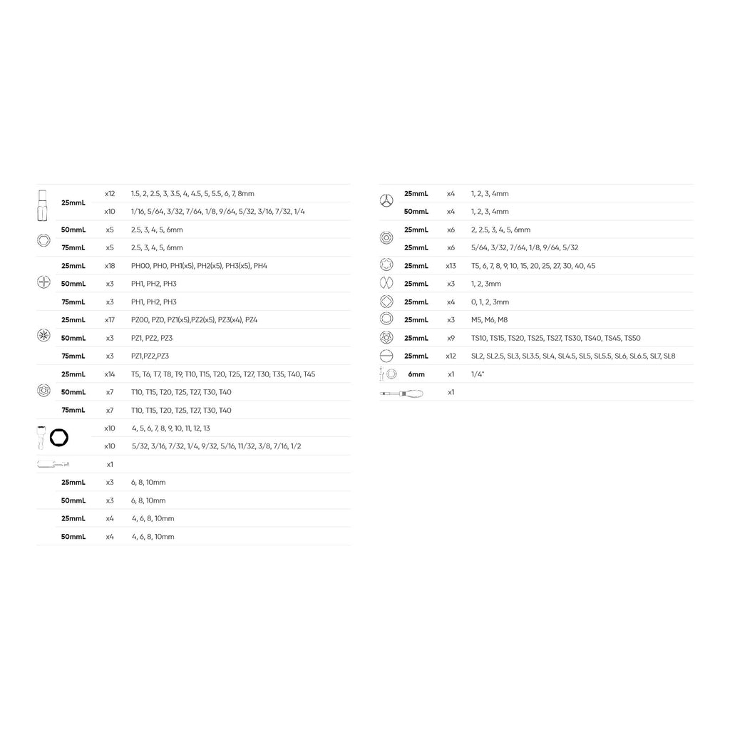 · 25 mm: PH00, PH0, PH1(x5), PH2(x5), PH3(x5), PH4