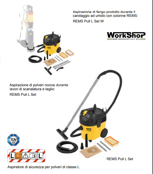 Potente aspiratore elettrico di materiale asciutto e bagnato con pulizia automatica del fi ltro. Per l’uso artigianale ed industriale. Aspirazione di polveri, sporco e liquidi. Ideale per la depolverazione durante lavori di fenditura, taglio, foratura, carotaggio e levigatura. Certifi cato come aspirapolvere e depolveratore di polveri nocive. Ideale per aspirare il fango prodotto durante il carotaggio. REMS Pull L Classe della polvere secondo EN 60335-2-69 L Valore limite di esposizione sul posto di lavoro > 1 mg/m3 Grado di permeabilità ≤ 1 %