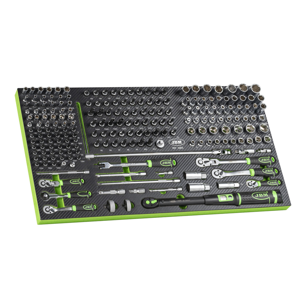 Finitura rigida simulata in fibra di carbonio. Questo modulo comprende una vasta gamma di bit socket, sia standard che protetti, di diverse dimensioni e tipi, insieme a diverse maniglie a cricchetto e prolunghe per entrambe le dimensioni, 1/4" e 3/8". Inoltre, sono inclusi accessori come adattatori, offrendo una soluzione completa per far parte di un kit di attrezzi versatile.