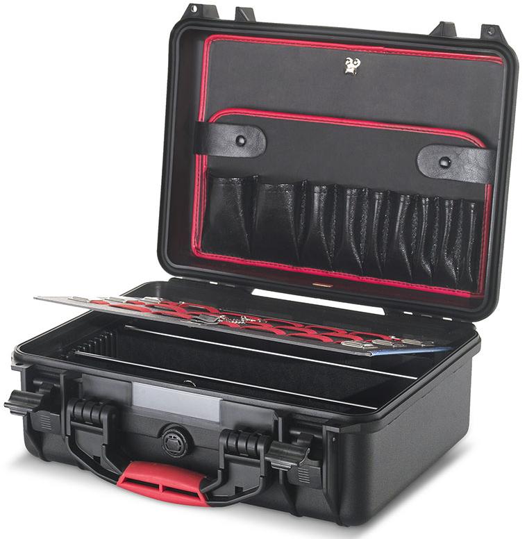 Versione porta utensili per assistenza tecnica professionale: 1 pannello in abs con passanti elasastici. Doppia tasca in cuoio e materiale antigraffio nel coperchio. Fondo con scomparti regolabili. Valvola di pressurizzazione e anelli per lucchetto.