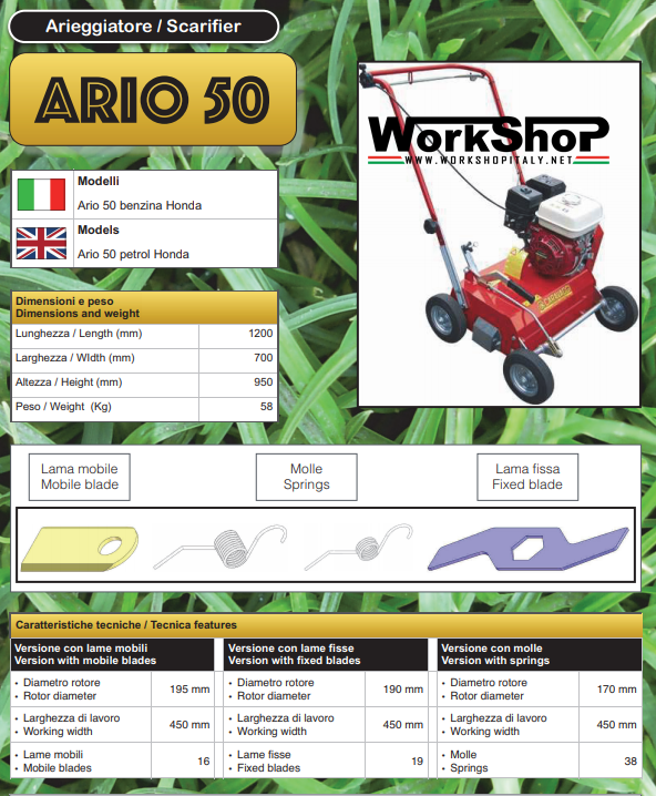 L’arieggatore ARIO, è disponibile nelle versioni 40 / 50 / 60 / 120, costituendo una vasta gamma adatta alle varie esigenze di utilizzo, equipaggiate con motore a scoppio.