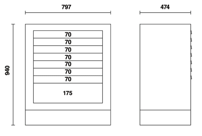 - 8 cassetti da 588x367 mm, montati su guide telescopiche a sfera