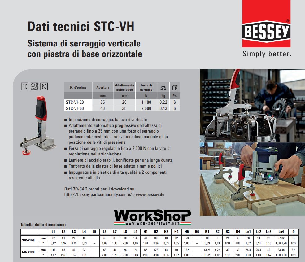 {"id":1404205367351,"title":"Sistema di serraggio verticale Bessey STC-VH","handle":"sistema-di-serraggio-verticale-bessey-stc-vh","description":"\u003cp\u003eSistema di serraggio verticale Bessey STC-VH\u003c\/p\u003e\n\u003cp\u003e\u003cimg src=\"\/\/cdn.shopify.com\/s\/files\/1\/0325\/3433\/files\/Cattura_7548a9f8-a98c-4114-a0ca-0e9e595973df_large.PNG?v=1537977361\" alt=\"\"\u003e\u003c\/p\u003e\n\u003ch4\u003eSTC-VH\u003c\/h4\u003e\n\u003cp\u003ePiastra di base orizzontale\u003cbr\u003eAltezza di serraggio: fino a max. 40 mm\u003cbr\u003eAdattamento automatico: fino a 35 mm\u003cbr\u003eForza di serraggio: fino a 2.500 N\u003c\/p\u003e\n\u003cdiv id=\"x-content-band-3\" class=\"x-content-band vc\"\u003e\n\u003cdiv class=\"x-container wpb_row\"\u003e\n\u003cdiv class=\"x-column x-sm vc x-1-1\"\u003e\n\u003cp\u003ePer i sistemi di serraggio rapido verticale il fissaggio del pezzo si svolge come per i sistemi di serraggio orizzontale. In questo caso tuttavia la leva si sposta per il serraggio dal basso verso l’alto e rimane in posizione di serraggio verticale rispetto al banco. Questo può essere estremamente utile se si devono lavorare punti di difficile accesso o svolgere operazioni di fronte ai supporti di serraggio.\u003cbr\u003eI sistemi variabili di serraggio verticale sono disponibili con piastra di base orizzontale e aperture di 35 e 40 mm.\u003c\/p\u003e\n\u003c\/div\u003e\n\u003c\/div\u003e\n\u003c\/div\u003e\n\u003cdiv id=\"x-content-band-4\" class=\"x-content-band vc\"\u003e\n\u003cdiv class=\"x-container wpb_row\"\u003e\n\u003cdiv class=\"x-column x-sm vc x-1-1\"\u003e\n\u003ch4\u003eCaratteristiche del prodotto:\u003c\/h4\u003e\n\u003cul class=\"productFeatures\"\u003e\n\u003cli\u003eIn posizione di serraggio, la leva è verticale\u003c\/li\u003e\n\u003cli\u003eAdattamento automatico progressivo dell’altezza di serraggio con una forza di serraggio praticamente costante – senza modifica manuale della posizione delle viti di pressione\u003c\/li\u003e\n\u003cli\u003eForza di serraggio regolabile con la vite di regolazione nell’articolazione\u003c\/li\u003e\n\u003cli\u003eLamiere di acciaio stabili, bonificate per una lunga durata\u003c\/li\u003e\n\u003cli\u003eTraforato della piastra di base adatto a mm e pollici\u003c\/li\u003e\n\u003cli\u003eImpugnatura in plastica di alta qualità a 2 componenti resistente all’olio\u003c\/li\u003e\n\u003c\/ul\u003e\n\u003c\/div\u003e\n\u003c\/div\u003e\n\u003c\/div\u003e\n\u003cp\u003e\u003cimg src=\"\/\/cdn.shopify.com\/s\/files\/1\/0325\/3433\/files\/Cattura_b1d2792d-384a-4e1c-b396-309839550e6f_large.PNG?v=1537977416\" alt=\"\"\u003e\u003c\/p\u003e","published_at":"2018-09-25T23:27:36+02:00","created_at":"2018-09-26T17:52:54+02:00","vendor":"Bessey","type":"Serraggio Rapido","tags":["Bessey","serraggio rapido"],"price":2642,"price_min":2642,"price_max":3049,"available":true,"price_varies":true,"compare_at_price":null,"compare_at_price_min":0,"compare_at_price_max":0,"compare_at_price_varies":false,"variants":[{"id":12664729862199,"title":"STC-VH20 35mm","option1":"STC-VH20 35mm","option2":null,"option3":null,"sku":"","requires_shipping":true,"taxable":true,"featured_image":null,"available":true,"name":"Sistema di serraggio verticale Bessey STC-VH - STC-VH20 35mm","public_title":"STC-VH20 35mm","options":["STC-VH20 35mm"],"price":2642,"weight":0,"compare_at_price":null,"inventory_quantity":0,"inventory_management":null,"inventory_policy":"deny","barcode":"","requires_selling_plan":false,"selling_plan_allocations":[],"quantity_rule":{"min":1,"max":null,"increment":1}},{"id":12664732647479,"title":"STC-VH50 40mm","option1":"STC-VH50 40mm","option2":null,"option3":null,"sku":"","requires_shipping":true,"taxable":true,"featured_image":null,"available":true,"name":"Sistema di serraggio verticale Bessey STC-VH - STC-VH50 40mm","public_title":"STC-VH50 40mm","options":["STC-VH50 40mm"],"price":3049,"weight":0,"compare_at_price":null,"inventory_quantity":0,"inventory_management":null,"inventory_policy":"deny","barcode":"","requires_selling_plan":false,"selling_plan_allocations":[],"quantity_rule":{"min":1,"max":null,"increment":1}}],"images":["\/\/www.workshopitaly.net\/cdn\/shop\/products\/STC-VH25_ts.jpg?v=1623480720","\/\/www.workshopitaly.net\/cdn\/shop\/products\/Cattura_6f083867-abd4-41d5-b28a-7c7356485390.PNG?v=1623480720","\/\/www.workshopitaly.net\/cdn\/shop\/products\/Cattura_3d7004ca-b365-42be-8b20-88dc492fda37.PNG?v=1623480720"],"featured_image":"\/\/www.workshopitaly.net\/cdn\/shop\/products\/STC-VH25_ts.jpg?v=1623480720","options":["Misura"],"media":[{"alt":null,"id":37543608456,"position":1,"preview_image":{"aspect_ratio":1.25,"height":160,"width":200,"src":"\/\/www.workshopitaly.net\/cdn\/shop\/products\/STC-VH25_ts.jpg?v=1623480720"},"aspect_ratio":1.25,"height":160,"media_type":"image","src":"\/\/www.workshopitaly.net\/cdn\/shop\/products\/STC-VH25_ts.jpg?v=1623480720","width":200},{"alt":null,"id":37543641224,"position":2,"preview_image":{"aspect_ratio":1.164,"height":846,"width":985,"src":"\/\/www.workshopitaly.net\/cdn\/shop\/products\/Cattura_6f083867-abd4-41d5-b28a-7c7356485390.PNG?v=1623480720"},"aspect_ratio":1.164,"height":846,"media_type":"image","src":"\/\/www.workshopitaly.net\/cdn\/shop\/products\/Cattura_6f083867-abd4-41d5-b28a-7c7356485390.PNG?v=1623480720","width":985},{"alt":null,"id":37543673992,"position":3,"preview_image":{"aspect_ratio":2.179,"height":420,"width":915,"src":"\/\/www.workshopitaly.net\/cdn\/shop\/products\/Cattura_3d7004ca-b365-42be-8b20-88dc492fda37.PNG?v=1623480720"},"aspect_ratio":2.179,"height":420,"media_type":"image","src":"\/\/www.workshopitaly.net\/cdn\/shop\/products\/Cattura_3d7004ca-b365-42be-8b20-88dc492fda37.PNG?v=1623480720","width":915}],"requires_selling_plan":false,"selling_plan_groups":[],"content":"\u003cp\u003eSistema di serraggio verticale Bessey STC-VH\u003c\/p\u003e\n\u003cp\u003e\u003cimg src=\"\/\/cdn.shopify.com\/s\/files\/1\/0325\/3433\/files\/Cattura_7548a9