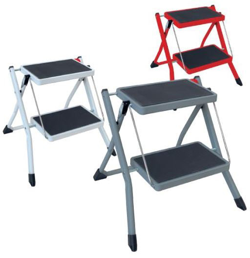 in acciaio 2 gradini, a norme EN 131 - portata kg.150 - pieghevoli, gradino rivestito in gomma antiscivolo, verniciati con polveri epossidiche, minimo ingombro chiusi cm.4 - altezza cm.43 - kg.3,4