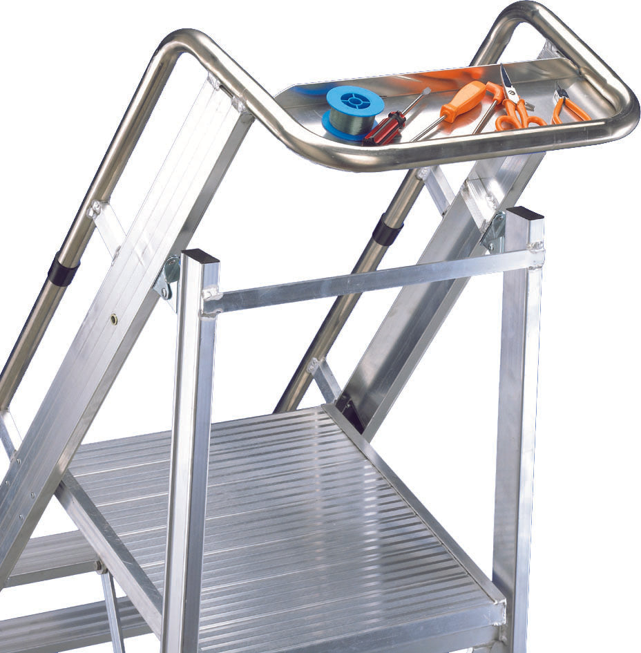 Provvista di 2 ruote, 2 braccioli, piattaforma, pianetto portattrezzi, corrimani e guarda-corpo. Dotata di barre antiapertura/chiusura accidentale è ideale per utilizzo professionale. Prodotta secondo la normativa italiana vigente D.lgs 81/08 e la normativa europea UNIEN131.