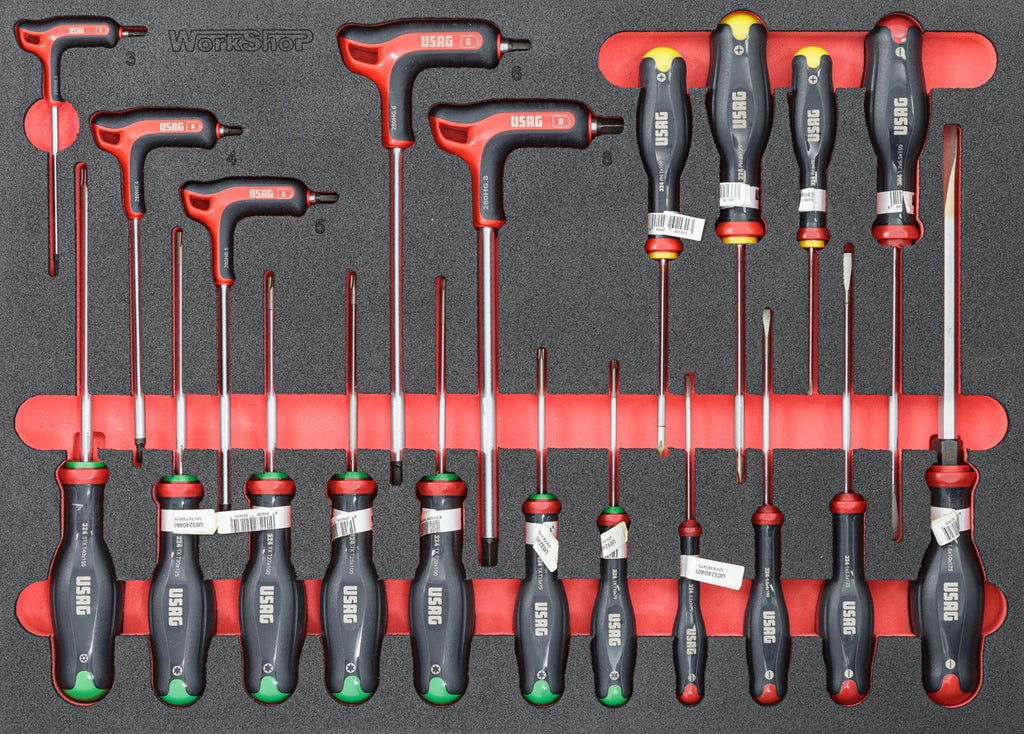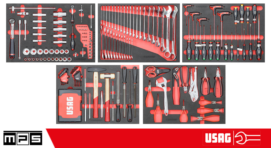 Allestimento TOP composto da 267 utensili professionali USAG in termoformato di spugna bicolore, compatibile con tutta la gamma di arredo officina MPS