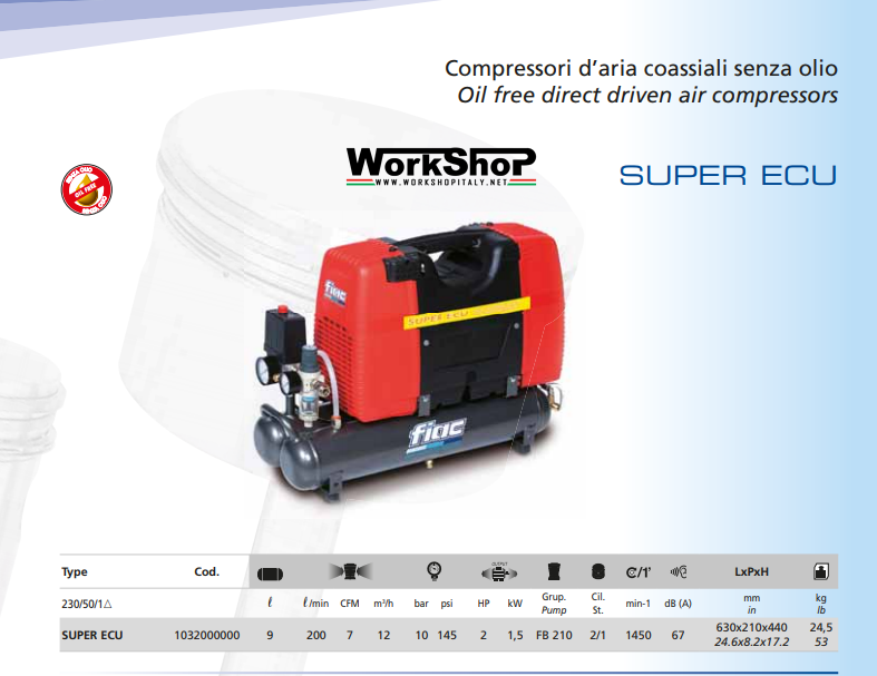 Il SUPER ECUè un prodotto FIAC, azienda leader nella produzione dei compressori MADE in ITALY ed è rivolto soprattutto all'uso nel settore professionale (artigiani, falegnami, imbianchini, carrozzieri, muratori) e a coloro che hanno bisogno di un valido aiuto direttamente nei luoghi di lavoro o aldifuori dei propri laboratori. E' trasportabile in assoluta sicurezza in quanto non ha lubrificazione ad olio e non ha problemi di fuoriuscita del lubrificante.