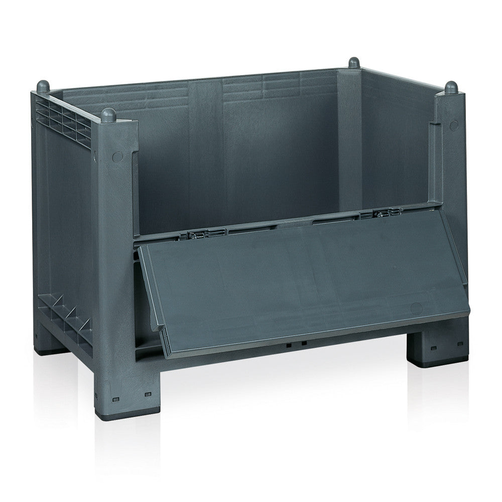 Contenitore in polipropilene con sportello, sovrapponibile 1+3. Inattaccabile da alcali, oli, solventi e acidi. Portata kg.500. Capacità lt.570. Antracite. Dim.esterne: mm.1200x800x850h. Dim.utili int.: mm.1130x730x695h.