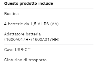 | Alimentazione | Batteria al litio da 12 V, 4 batterie da 1,5-V-LR6 (AA), 4 pile da 1,2 V HR06 (AA) |