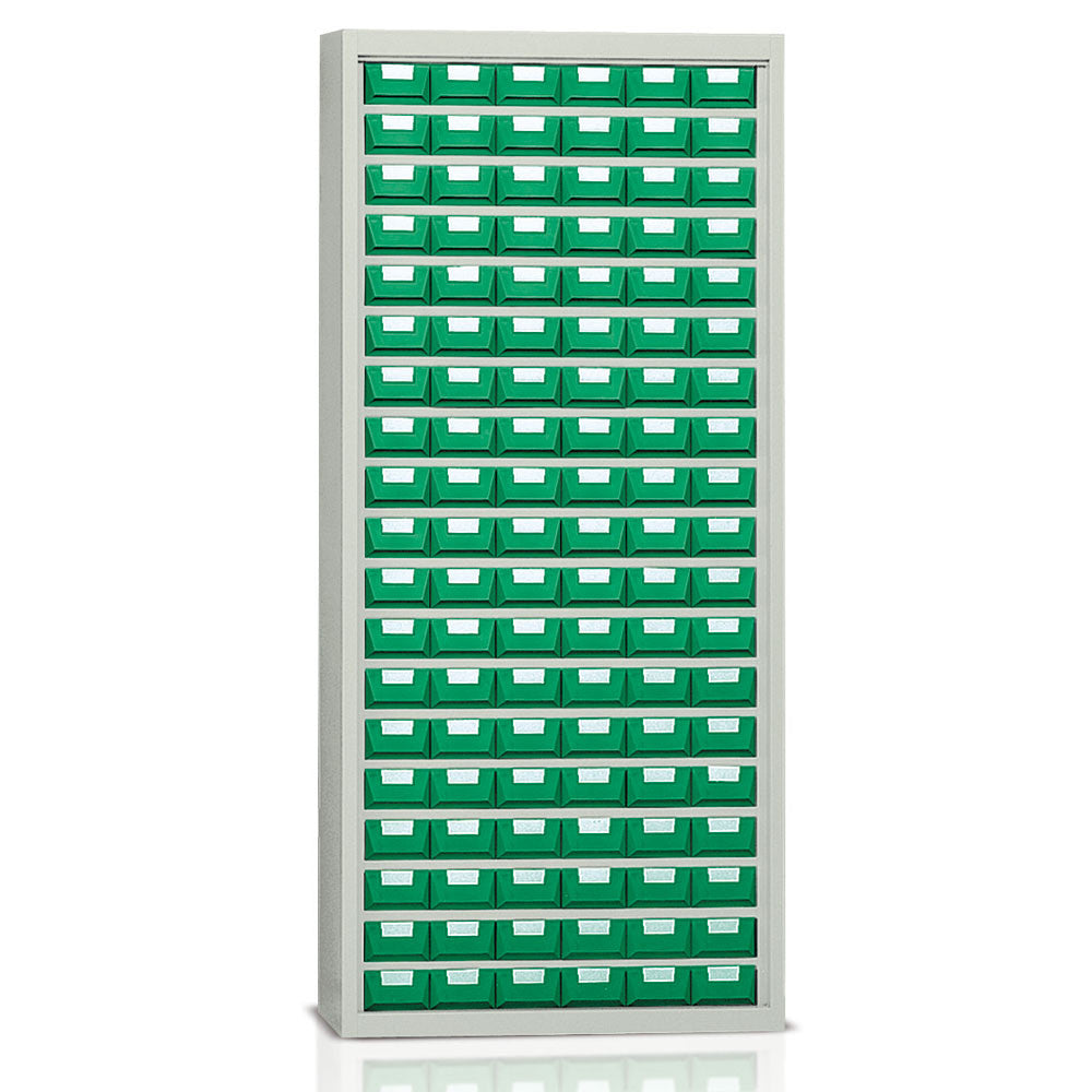 Scaffale in lamiera d’acciaio sp.8/10 a 114 cassetti in plastica verde di mm.130x300x70h, etichette in cartoncino bianco con protezione in PVC e 228 separatori. Verniciatura a forno con polveri epossidiche grigio RAL 7038. Dim.: mm.900x355x2000h.