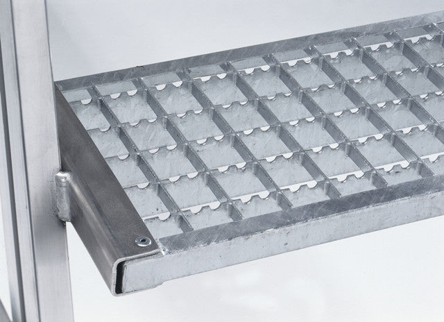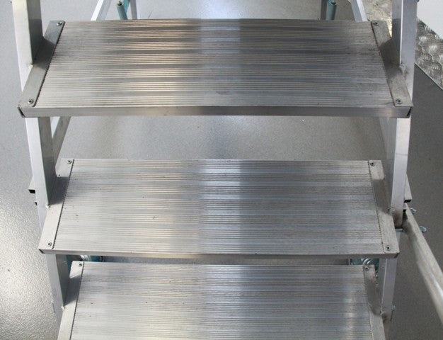 Costruita in alluminio estruso nervato con ampia piattaforma di lavoro, fermapiedi e guarda-corpo di protezione alto 1 metro che avvolge l’operatore proteggendolo su tutti i lati. La rampa di salita larga e comoda ha un’inclinazione di 55° per una salita più semplice garantita anche dai gradini piani antisdrucciolo profondi 20 cm e con distanza di soli 23 cm l’uno dall’altro.