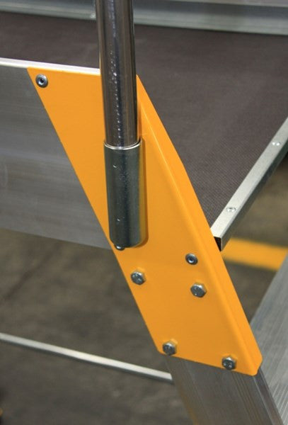 Costruita in alluminio estruso nervato con ampia piattaforma di lavoro, fermapiedi e guarda-corpo di protezione alto 1 metro che avvolge l’operatore proteggendolo su 3 lati. Le piastre di giunzione tra rampa, schienale e piattaforma sono in acciaio verniciato. Per evitare alti costi di trasporto la scala è fornita smontata e può essere facilmente assemblata tramite il libretto istruzioni dettagliato. Lo schienale è quasi perpendicolare al terreno in modo da permettere all’operatore di avvicinarsi frontalmente al muro o al macchinario.