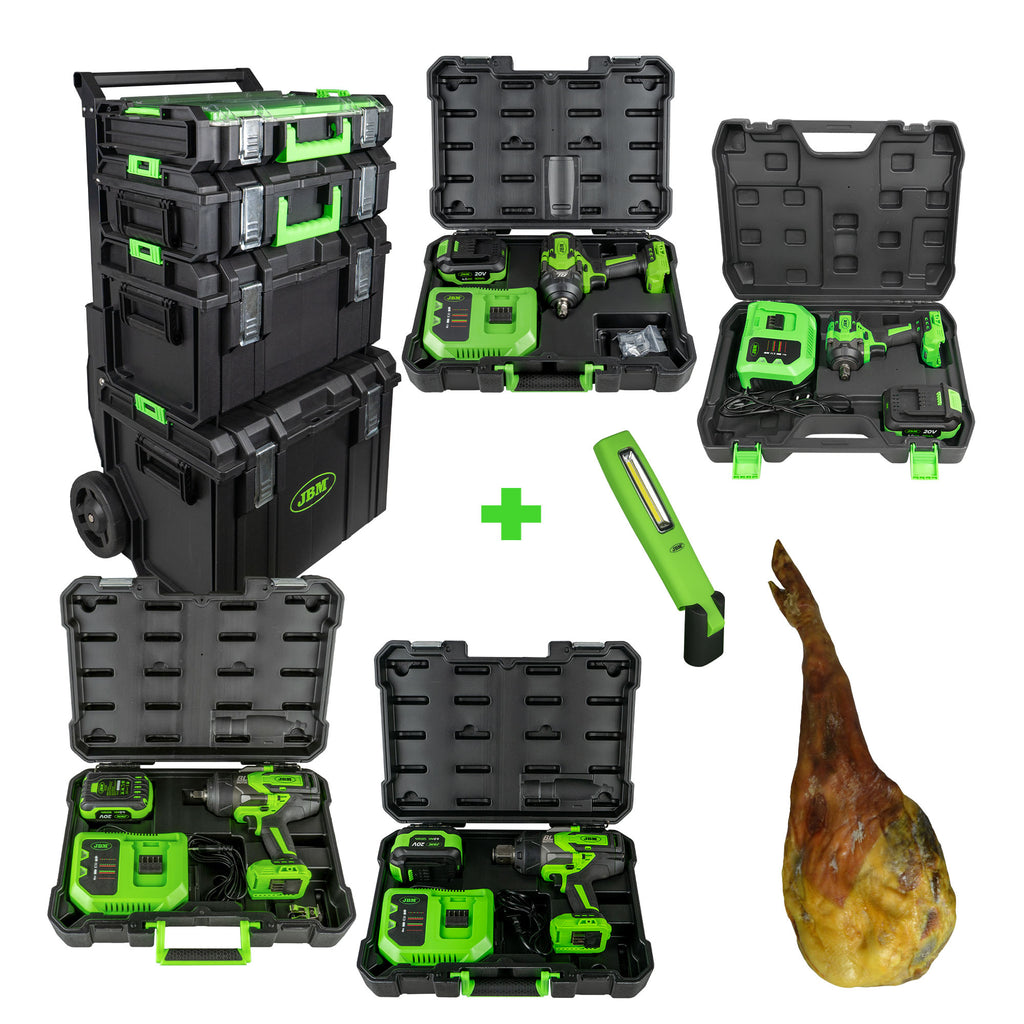 Set di chiavi a percussione: 1/2" 800NM + 1/2" 1300NM + 1" 2300N + 1/2" 1000NM + utensile portatile per officina + carrello JBM SERIES493P + prosciutto crudo iberico 6kg.