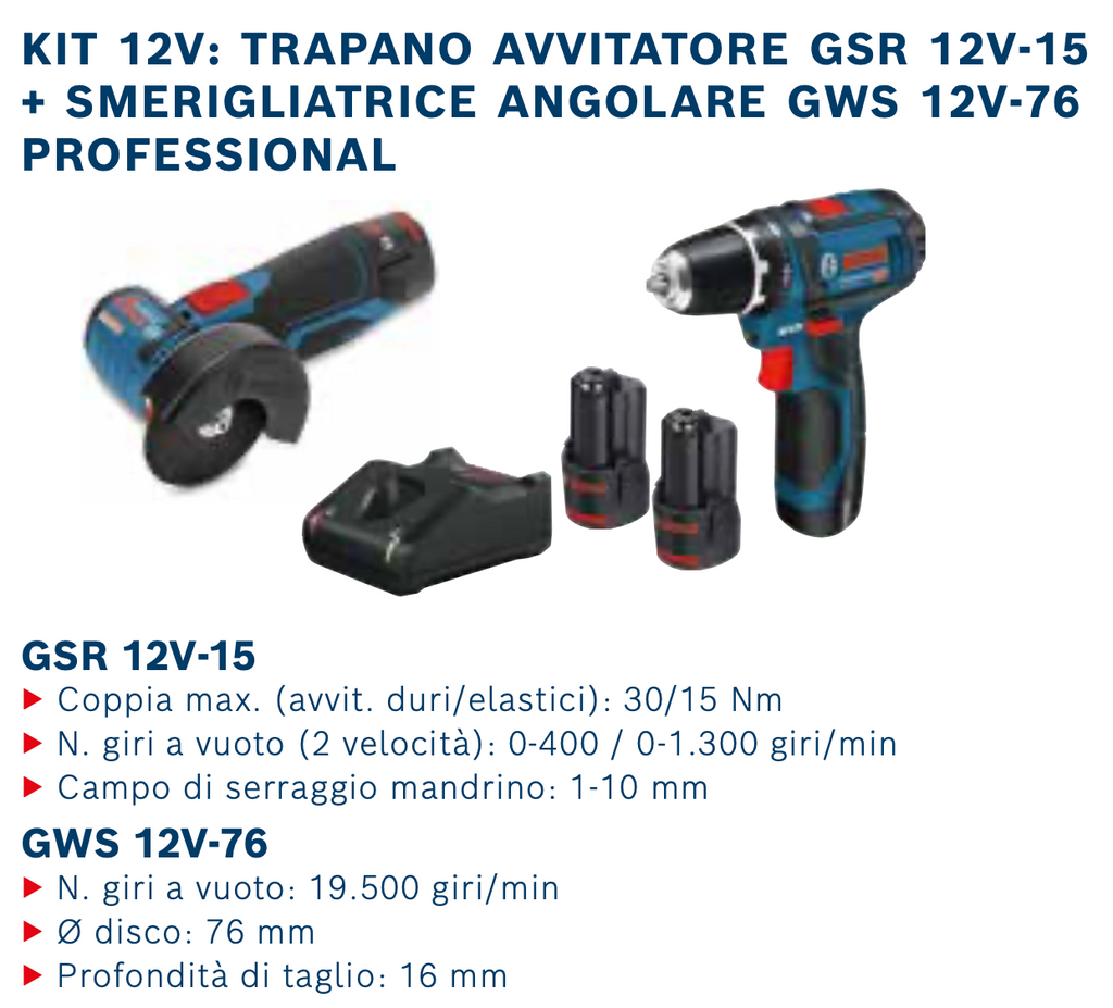 KIT 12V: TRAPANO AVVITATORE GSR 12V-15 + SMERIGLIATRICE ANGOLARE GWS 12V-76 PROFESSIONAL