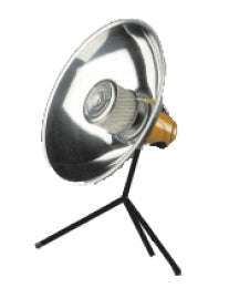 a raggi infrarossi con parabola riflettente in alluminio, bruciatore in acciaio inox, con valvola di sicurezza e regolatore di pressione, dati tecnici: consumo g./h.170, potenza watt 2300, ingombro cm.34x47x26, peso kg.3,1