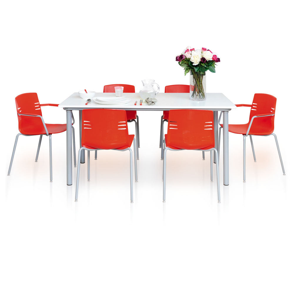 Tavolo mensa con struttura metallica in tubo di acciaio diam. mm.50 e telaio di collegamento diam.mm.30, verniciato a forno con polveri epossidiche colore alluminio. Piano sp.mm.20 placcato in laminato plastico opaco bianco con bordo in ABS raggio mm.2. Smontato. Dim.: mm.1600x800x760h.